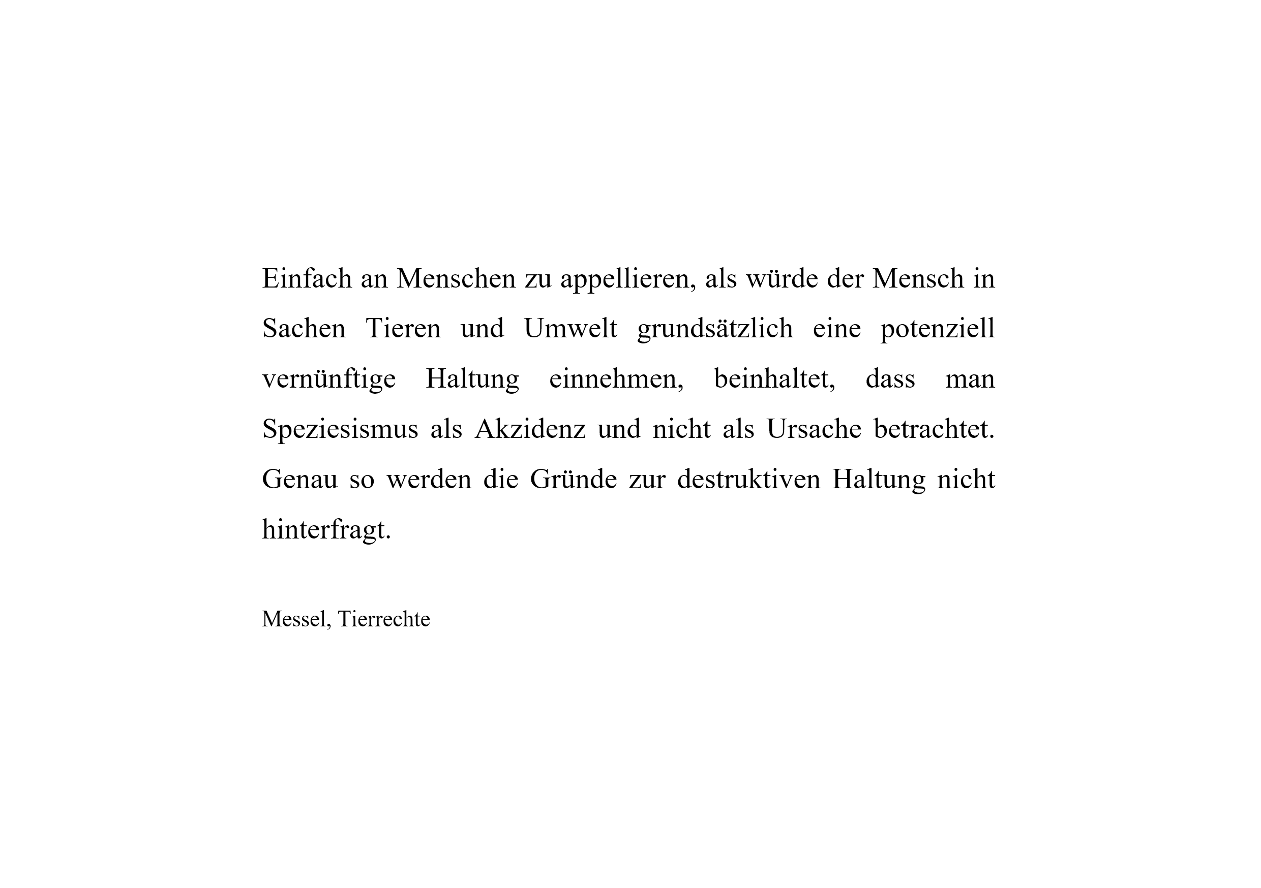 Einfach an Menschen zu appellieren, als würde der Mensch in Sachen Tieren und Umwelt grundsätzlich eine potenziell vernünftige Haltung einnehmen, beinhaltet, dass man Speziesismus als Akzidenz und nicht als Ursache betrachtet. Genau so werden die Gründe zur destruktiven Haltung nicht hinterfragt.